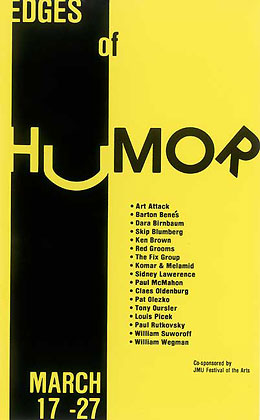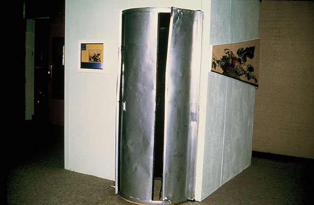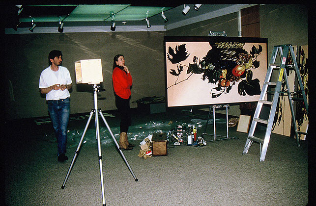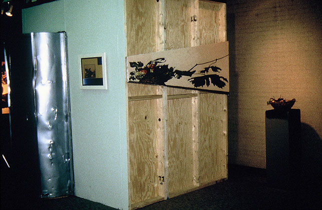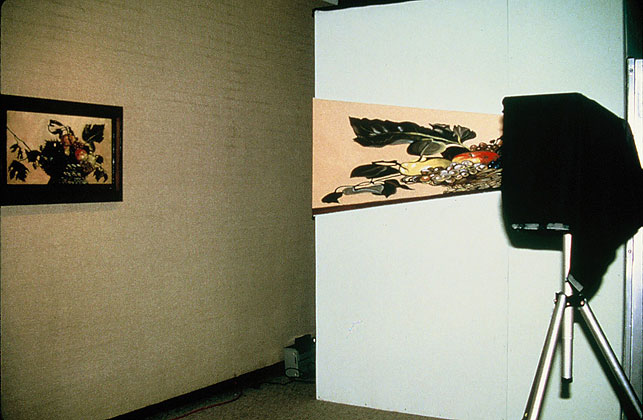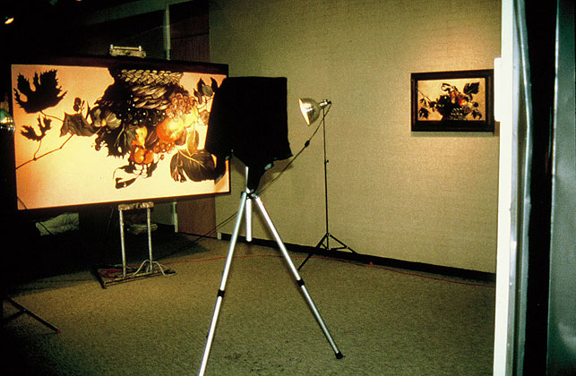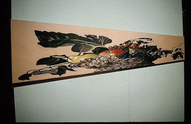The show was supposed to be called Humor and Art Attack had been invited to participate. The problem was, as Lynn put it: "Art Attack doesn't DO Humor." She and Evan and Alberto seemed to be stuck for an idea. Mark Clark suggested they kick Caravaggio's Basket of Fruit around some more and see what happens. Mark Clark had a bunch of different versions of copies of the painting, two life sized ones, one of which was reversed or mirrored, a postcard sized version, two anamorphic views of the picture that were completely different until you viewed them from their ends and finally a five by eight foot copy. How do you make a joke out of a classical painting of fruit? You buy a basket, fill it with apples grapes and pairs (figs were unavailable), then you construct an eight by eight by eight foot camera obscura with a dark room revolving door, hang the copies on four sides and put the giant version upside down on an easel lit by flood lights in front of the hole in the camera obscura. People would walk around the gallery looking at the different versions of the painting, then step into the giant box and stand there looking at the image of the fruit materializing on the back wall as their eyes adjusted to the dim light that came only through the hole in the front wall. They'd stand there wondering where was the punch line until somebody walked in front of the easel outside and their image would appear on the back wall of the camera obscura upside down. Light travels in a straight line. The resultant laughter would cause whoever had walked in front of the easel to wonder what was the joke, then enter the box, experience the trick of light, and inadvertently lure the next victim in with his own laughter. —Mark Clark