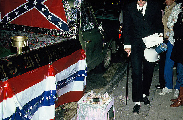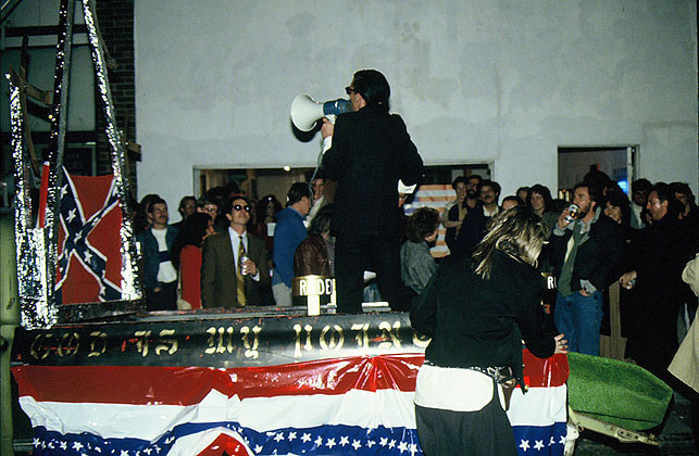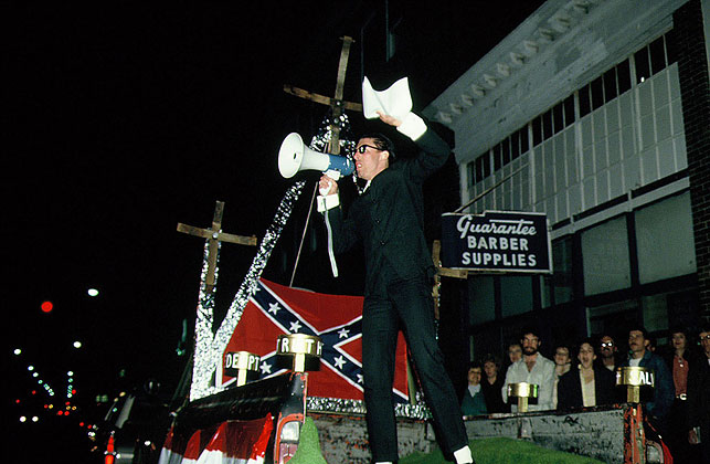 flag, tithing trays, evangelical slogans, and a roof-mounted megaphone.