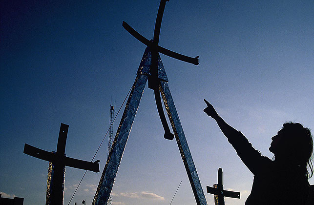 The truck bed was crowned with three crucifixes constructed out of leaf